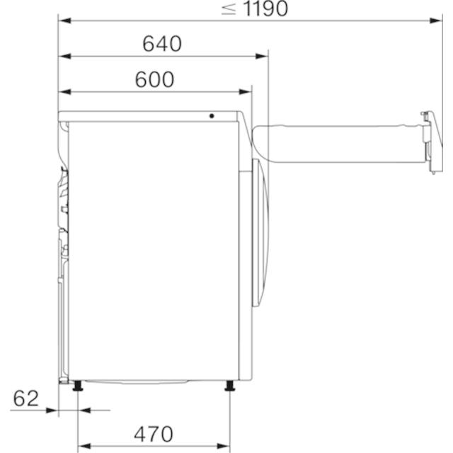Technischer Umriss einer Dunstabzugshaube mit Maßangaben in Millimetern: 62, 470, 600, 640 und 1190. Seitenansicht, grauer Hintergrund.