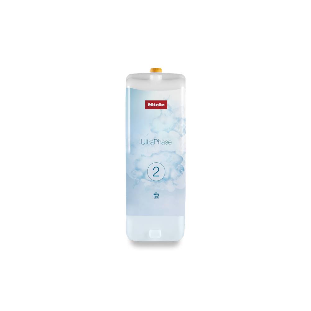 Weißer Kunststoffkanister mit blauem Etikett „UltraPhase“ und Ziffer „2“. Produkt von Miele, Spülmaschinenreiniger.