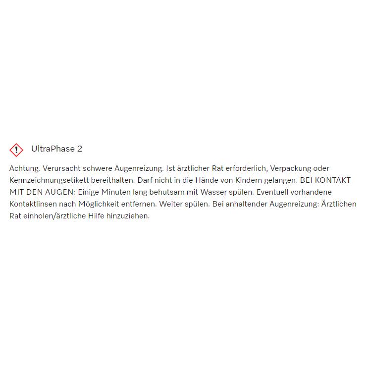 Text auf weißem Hintergrund: „UltraPhase 2“. Warnhinweise zu Augenreizung und Handhabung von Kontaktlinsen. Ärztlicher Rat empfohlen.