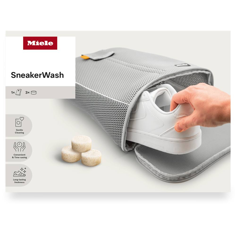 Weiße Sneaker in einem Wäschenetz, beworben als "SneakerWash" von Miele, mit Symbolen für schonende Reinigung und Komfort.