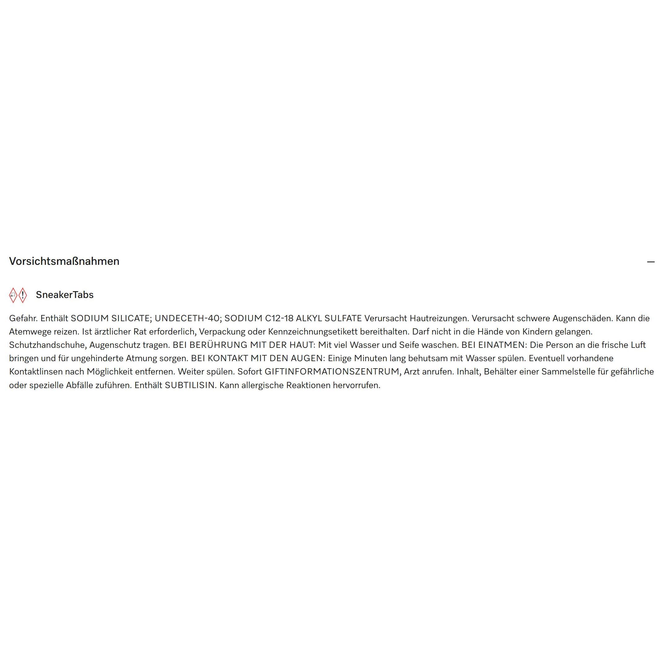 Warnhinweise und Sicherheitsanleitungen für „SneakerTabs“, enthaltend Natriumsilikat, Undeceth-40, Natriumlaurylsulfat und Subtilisin.